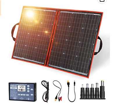 Le plus facile à mettre en place est un panneau solaire assez puissant (100 W) avec une batterie 12V et un boitier régulateur. On utilisera le 12 V comme source de tension pour alimenter tous les autres appareils :